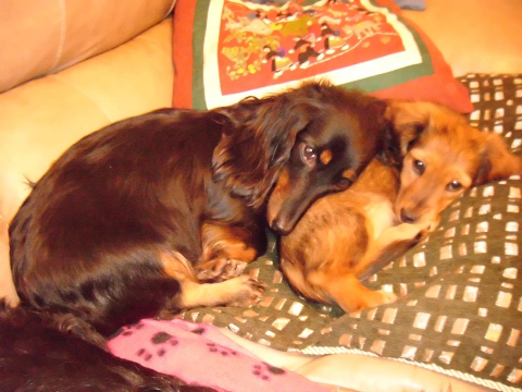 Of course, I should not forget everyone else, and here you have a picture in which I do not appear! Yes, such pictures exist! The next picture shows Dolly and Effie. Despite their age difference of 4½ human years (or almost 20 Dachshund years), they appear to have formed a special kinship and are often seen together.