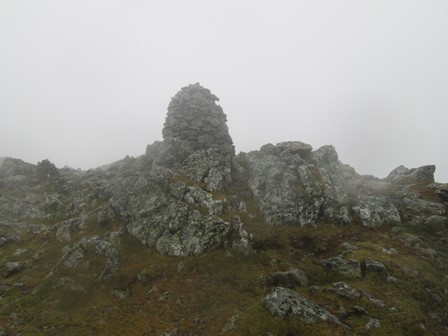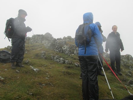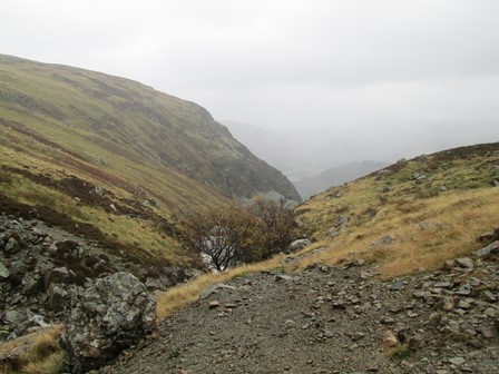 On our final day in Patterdale we were keen to do a high level walk and had Helvellyn in our sights. From Glenridding we ascended the valley to the Helvellyn YHA and the neighbouring hostel. The workings of the neighbouring Greenside Lead Mine, which closed in 1960, were still much in evidence. After an interesting ascent to what could be described as a high level but protected plateau, we eventually made it to Sticks Pass which was already in the clouds. On through the clouds, wind and rain, to Raise we went but eschewed our original plan of getting to Helvellyn. So Raise, at 883 m was thus the highest point we reached on our Patterdale visit. After reaching the Whiteside bank at 863 m we made our way out of the clouds along a well laid out track to get back to the old Greenside Mine and the two hostels. From here we rejoined our morning path to return to Patterdale. Our walk was ably led and navigated by John B., to whom many thanks!