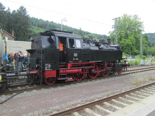 Die ˝64er˝ Dampflok hält in Sinsheim, am Wege von Neckargemünd nach Bad Friedrichshall.