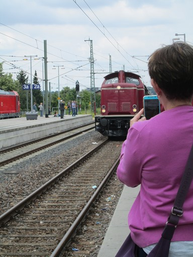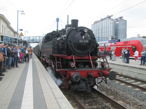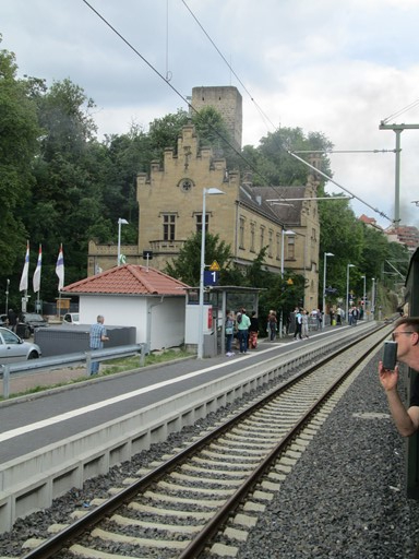 Bald erreichen wir den historischen Bahnhof von Bad Wimpfen. Da sind’s noch einige Minuten in der Warteschleife, bevor der Zug von Bad Friedrichshall mit der ˝64er˝ Dampflok uns passiert.