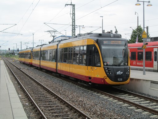 Heilbronner Stadtbahn auf dessen Linie S42 von Heilbronn nach Sinsheim. Auf den gewöhnlichen Bahnstrecken fahren diese Züge