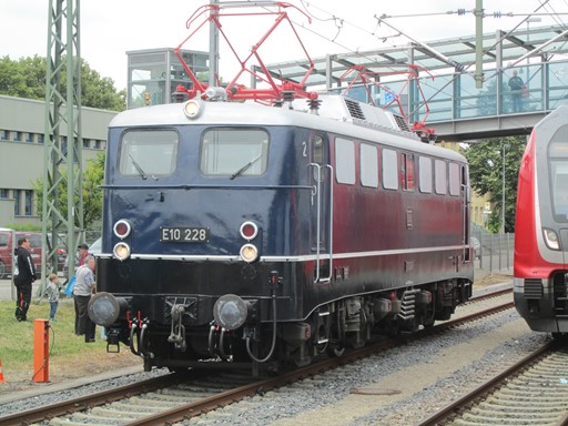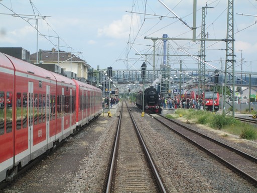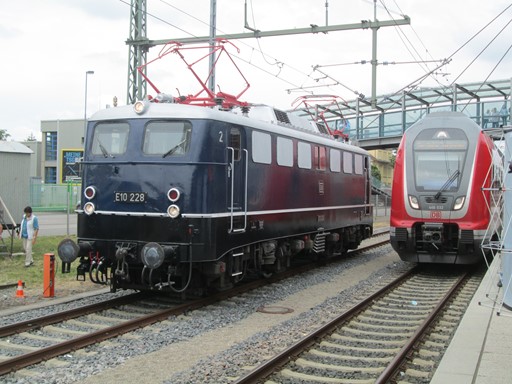 Man könnte sagen dass, Sinsheim so ungefähr am halbem Wege zwischen Neckargemünd und Bad Friedrichshall liegt. Nach Sinsheim kommt auch die gut befahrene Abzweigung nach Eppingen. Sinsheim war sozusagen das Zentrum der Feierlichkeiten. Besucher konnten Fahrzeuge aus der Vergangenheit (z.b. eine E-Lok der DB-Baureihe E10) sowie aus der näheren Zukunft (ein zweistöckiger Regionalzug der Baureihe 446) sehen und ˝inspizieren˝. Die Eisenbahnfreunde Kraichgau e. V., in ihrem historischen Lokschuppen, hielten auch ein Tag der offenen Tür. Also, in Sinsheim da war allerhand los und vieles wurde dem Besucher geboten.