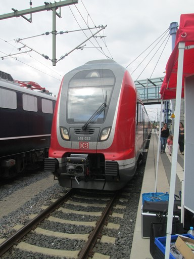 Daneben steht ein nagelneuer ˝TWINDEXX Vario˝ Doppelstock Triebzug der Baureihe ET 446.