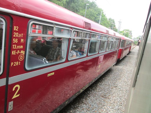 Am Rückwege nach Sinsheim passieren wir das ˝Auto- und Technik- Museum˝ in Sinsheim. Dann stehen wir eine Weile in einer Warteschleife um den regulären ˝S5˝ Zug aus Eppingen durchzulassen. In Sinsheim, da der ˝52er˝ Zug von Bad Friedrichshall aus Betriebs-mäßigen Gründen nur danach eine Station weiter – also bis nach Hoffenheim – fährt, ist es ratsam in Sinsheim auf den darauf folgenden Uerdinger Triebwagenzug von Eppingen zu warten. Das hat einen Vorteil. Vom letzten Wagen dieses ˝Uerdinger Zuges˝ kann ich einige interessante Aufnahmen bekommen.