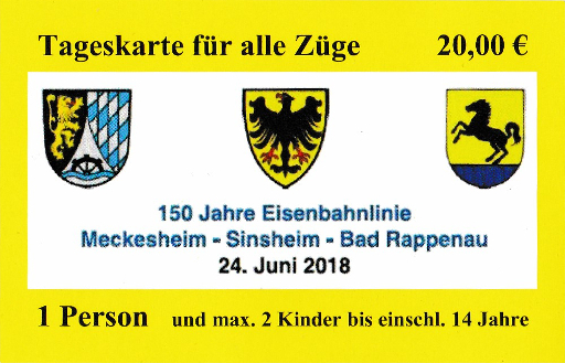 Auf der Reise erhielt ich diese farbenprächtige Tageskarte mit den Stadtwappen von ˝Meckse˝, ˝Sinse˝ und Bad Rappenau. Die Stecke von Meckesheim über Sinsheim nach Bad Rappenau stand ja heute im feierlichen Mittelpunkt.