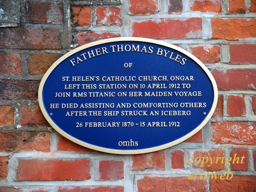 Ongar Station, at the Eastern end of the Epping Ongar Railway and formerly at the end of the Central Line, and before that, long ago, at the end of the branch in rural Essex of the Great Eastern Railway, has many stories to tell. One of these is the heroic but tragic story of an Ongar resident, one Father Thomas Byles (1870-1912) on the "Titanic". He had a place on one of the limited number of lifeboats, but gave his place to someone else; he went down with the ship.
