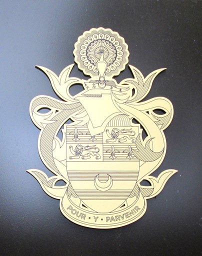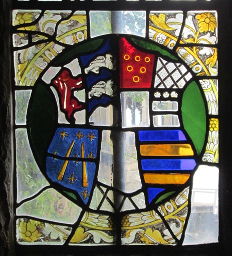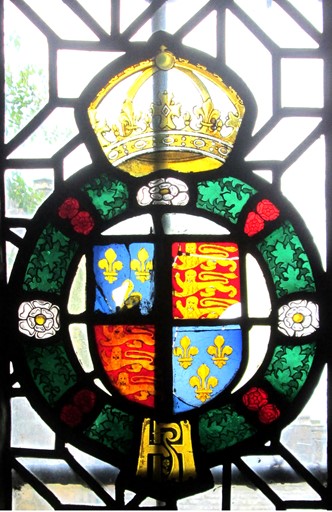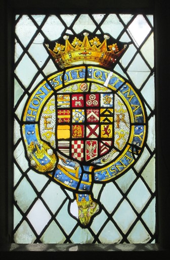 For less formal occasions, the Parlour would be the dining room instead of the Banqueting Hall. The leaded windows bear two coats of arms represented in colourful stained glass. On the left, the circular shield represents many generations and parts of the Vernon family, including the Vernons themselves, Avenell and Manners. On the right is an example of the old royal coat of arms bearing the lions and the French "fleur-de-lys".