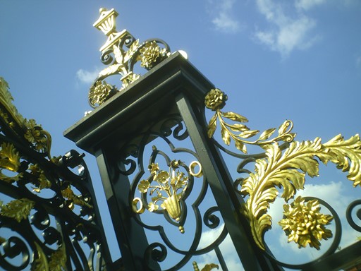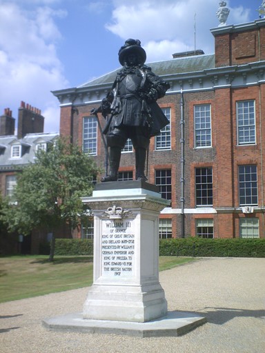 Coming from Kensington Road and Kensington High Street, we can approach the southern flank of Kensington Place by the "Gold Gate" with its elaborate gold and black iron work. Just beyond this, we are welcomed by King William proudly standing in front of his "King's Gallery", which we shall visit "in the next section".