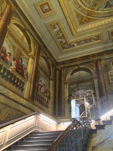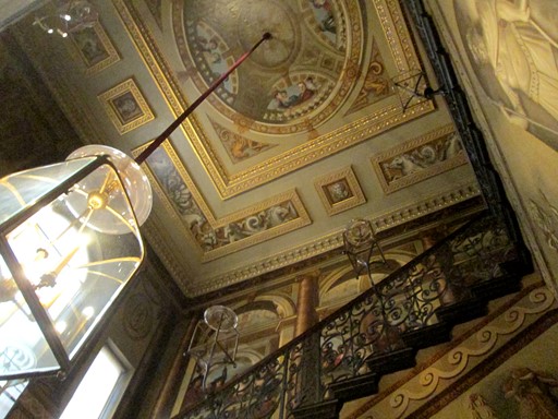 Anyone who was anyone in Georgian London and who wished to visit the king, would have climbed this staircase. This would have instilled a sense of awe in those seeking to have an audience with his majesty. By 1724, William Kent had replaced Christopher Wren's wooden panelling with these lively paintings with characters from George I's court. Kent was influenced by the Roman architecture he saw on a visit to the "Eternal City", and so placed these characters in the setting of a Roman building.