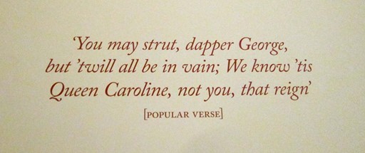 Note the queen's pastimes. At the time, the important task of the womenfolk was to produce children, and in the royal context, this meant an heir. The affairs of state were left to the menfolk. However, not many years later, Queen Caroline, the wife of George II, was to show that women should also have their say when it came to matters of politics and administration.