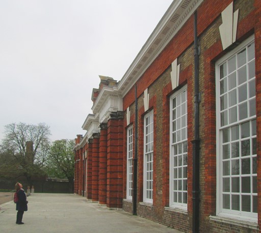 As we approach Kensington Palace from Queensway, we first meet the Orangery which Queen Anne had built in 1704 to the design of one John Vanbrugh. Its purpose was to protect Anne's citrus trees from the winter frosts. For the record, the Orangery is 28 metres (92 ft) long and was once the largest glass house in Britain; at one time, the Orangery also had underfloor heating. Oranges and citrus fruit were regarded as special exotic fruits at the time, and orangeries [see more] were prestige buildings, allowing citrus fruit to be available in winter time.