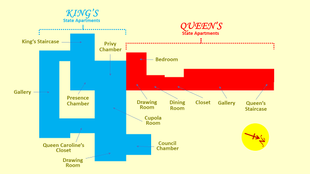 The State Apartments comprise both the King's State Apartments and the Queen's State Apartments. These are connected and occupy part of the second floor of Kensington Palace. The Queen's State Apartments date back to 1693 when William III and Mary II took over and extended the original Nottingham House. (See Time Line). The present King's State Apartments are due to King George I, who modified and extended the Apartments of William III. George II, who reigned from 1760 to 1820, made no substantial additions to the Palace.