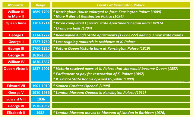 Here is a highly condensed time line of the rich and varied history of Kensington Palace. From 1698 to 1760 it was the main residence of the British Monarch. Subsequently it was alloweed gradually to fall into disrepair until "saved" by Queen Victoria for the benefit of future members of the Royalty and also for the benefit of the Nation.