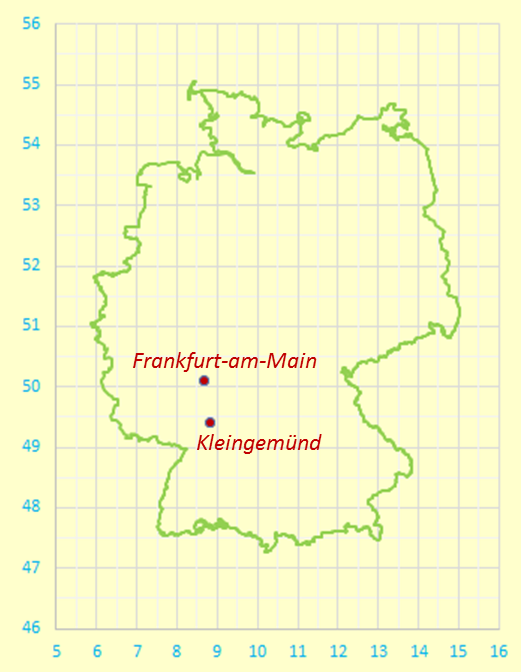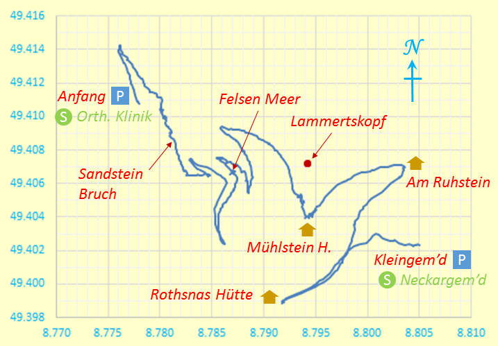 Der Ausgangspunkt unserer Wanderung war vom Parkplatz auf der anderen Seite des Neckars von der S-Bahn Station, "Orthopädische Klinik". Um einen Bezugsrahmen zu schaffen, gebe ich die Entfernungen von Frankfurt (Römer) und Heidelberg (Bismarck Platz) an. Diese sind direkte Linien (Vogelfluglinien) - und stellen eine theoretische mindest Entfernung da. Frankfurt, als Verkehrsknotenpunkt ist oft die Stadt der Anreise von Besuchern der heidelberger Gegend. Und noch eine Bemerkung. Da die meisten magnetischen Kompaße nur 16 Richtungen angeben, ist die Bezeichnung, (z.b. Ost, Süd usw.) natürlich nicht so genau wie die Richtung in Grad (Wertebereich 0° bis 360°) ausgedrückt.