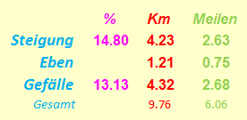 Interessenhalber können wir auch die Durchschnittsneigungen betrachten die wir auf unserer Wanderung begneten. Hier sehen Sie den durchschnitts Wert für die Steigung und auch für das Gefälle mit Bezug auf die jeweiligen Entfernungen. Höhen Variationen sogenannter ebenen Strecken betragen nicht mehr als ± ½ Meter.
