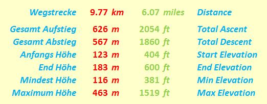 Hier sehen Sie einige Zahlen in metrischen (Km und meter) und englischen (meilen und fuß/feet) Maßeinheiten dargestellt. Die Wegstrecke ist, ganz genau gesehen, die Entferning gemessen auf der Oberfläche des WGS84 "Spheroid". Die Höhen beziehen sich auf das "Normal Null" Konzept.