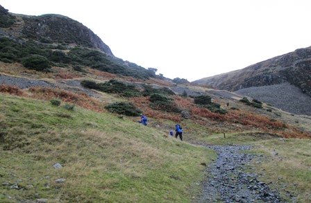 Greenside Lead Mine had closed in 1960, but its workings were still much in evidence. There was a reasonable road up from Glenridding up to the mine beccause close by there were two hostels, one a YHA. From here, the paths divided, and we took the steeper - and probably the more scenic - right hand option to Sticks Pass via a lively mountain stream and a high, but sheltered, plateau. Later in the afternoon, we would be descending on the left hand path.