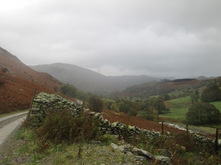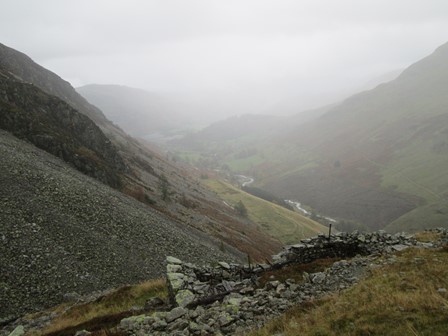 On our final day in Patterdale we were keen to do a high level walk and had Helvellyn in our sights. From Glenridding we ascended the valley to the Helvellyn YHA and the neighbouring hostel. The workings of the neighbouring Greenside Lead Mine, which closed in 1960, were still much in evidence. After an interesting ascent to what could be described as a high level but protected plateau, we eventually made it to Sticks Pass which was already in the clouds. On through the clouds, wind and rain, to Raise we went but eschewed our original plan of getting to Helvellyn. So Raise, at 883 m was thus the highest point we reached on our Patterdale visit. After reaching the Whiteside bank at 863 m we made our way out of the clouds along a well laid out track to get back to the old Greenside Mine and the two hostels. From here we rejoined our morning path to return to Patterdale. Our walk was ably led and navigated by John B., to whom many thanks!
