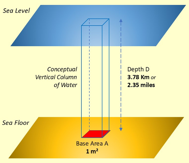Conclusion So Far: The Mass of this vertical column is 3777 Metric Tonnes sitting on an area of 1 square metre on the sea floor. This gives about 3717 UK Tons (Long Tons), since 1 Metric Tonne is equivalent to 0.984207 UK Tons (Long Tons).
